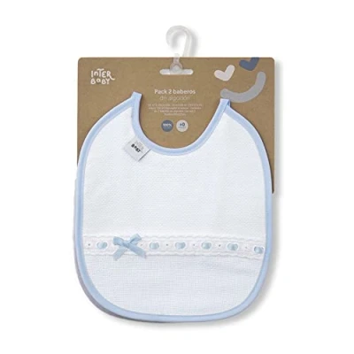 Pack of two rectangular shaped cotton bibs with color trim and matching ribbon strips. The front fabric is made of pique and the back in plain knit. The bibs are 20x25 cm and have the closure with a pair of ribbons. Bibs with a sweet design perfect as a gift. The product follows OEKO-TEX and REACH European regulations.