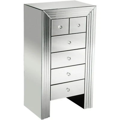 General description Keep your bedroom and living space organised and tidy with the stunning Interiors by Premier 6 Drawers Mirrored Drawer Chest. This contemporary piece combines functionality with glamour, offering six spacious drawers that provide ample storage for all your clothes, accessories, and essentials. Completely covered in mirrored glass, this chest reflects light beautifully, adding a touch of luxury and sophistication to your bedroom decor. The contemporary style edges enhance its aesthetic appeal and create a stunning visual effect, refracting both natural and artificial light to brighten your space and make it feel more open and airy. Crafted with high-quality materials, this chest is designed for reliable and durable use, ensuring it withstands daily use while maintaining its stylish appearance.