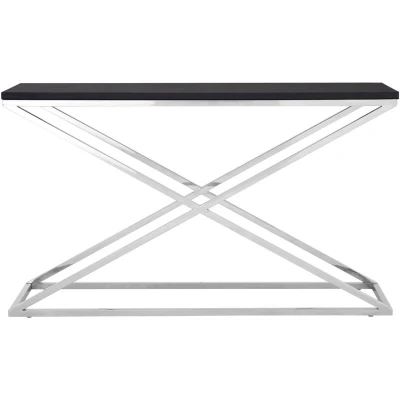 General description This Interiors by Premier black wood top hallway console table is a stunning addition to any modern living space. It seamlessly blends contemporary design with everyday functionality, making it a perfect choice for the style-conscious homeowner. The eye-catching modern style features a black, leather-effect top that offers luxury, complemented by a crisscross design of polished stainless steel legs that adds a touch of modern flair while ensuring exceptional stability. Built to last, this console table boasts a sturdy MDF top that can handle drinks, books, and décor with ease, creating a visually striking centerpiece that elevates any living room. Technical specifications Material: MDF top with leather-effect finish Legs: Polished stainless steel