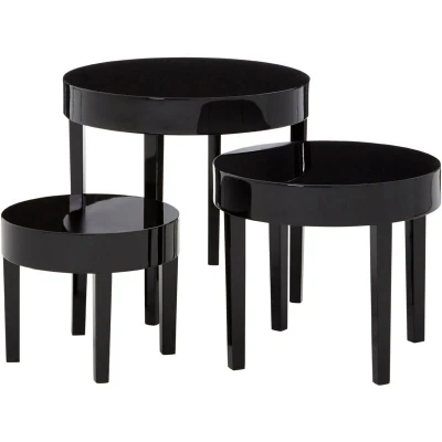 General description Upgrade your living space with the Set of Three Nesting Tables by Interiors by Premier, offering a perfect blend of style and functionality. This trio of sleek black nesting tables is meticulously crafted to elevate your home decor effortlessly. Crafted with a striking black high gloss finish, these coffee tables exude contemporary sophistication, enhancing the aesthetic appeal of any room they grace. Each side table features a chunky round top, providing ample surface area for various uses, from displaying decor to serving snacks and beverages during gatherings. The nesting tables' design is not only visually appealing but also practical, supported by slim squared legs made from renewable pine wood, striking the perfect balance between sturdiness and elegance. The use of renewable pine wood underscores a commitment to sustainability, ensuring that your furniture choice aligns with eco-conscious values. One of the standout features of this set is their space-saving