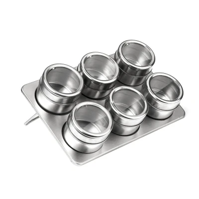 JoybuyThis magnetic spice jar set includes six durable stainless steel jars with clear lids for easy visibility and freshness. The adjustable tray allows flat or angled display, keeping spices organized, accessible, and clutter-free in any modern kitchen.