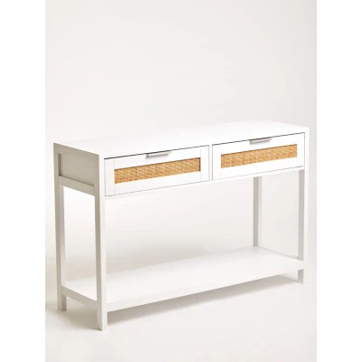 JoybuyThe Interiors by Premier Console Table 2 Drawers Sherman White/Rattan features a high-quality white wood frame with natural rattan drawer panels, a spacious tabletop, and an under shelf. Combining rustic charm and modern elegance, it offers ample storage and style for any hallway or living room.