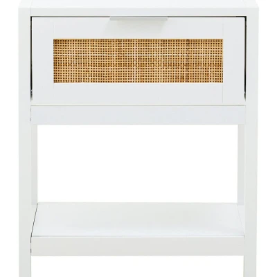 JoybuyThe Interiors by Premier Bedside Table Sherman 1 Drawer White/Rattan combines rustic charm with modern functionality, featuring durable white wood, natural rattan panels, and versatile storage with two open and two closed shelves—perfect as a bedside or living room companion. Its compact, lightweight design fits seamlessly into any space.