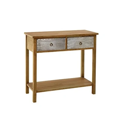 General description This Interiors by Premier two drawer console table is a stylish and functional addition to your home. Its modern design complements a variety of interior decors, featuring a natural wood grain finish crafted from durable MDF. The sleek aluminum drawer details add a touch of modernism, making this console table not only stylish but also incredibly functional. With two spacious drawers, it provides ample hidden storage for everyday essentials, helping you keep your home organized. The open tabletop offers additional storage space for books, magazines, decorative items, or anything you need to keep close at hand. Built with high-quality materials, this entryway table is sturdy and long-lasting, supported by strong fir wood legs that ensure stability for your favorite decor accessories, whether displayed in your entryway, living room, or bedroom. This versatile console table can easily adapt to your needs while adding a touch of contemporary style to any space.