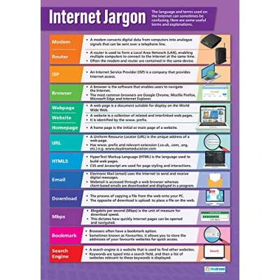 EDUCATIONAL CHART DESIGNED BY TEACHERS: Our Internet Jargon poster helps students to learn, engage and remember more information than ever before. Covering a basic overview of internet jargon definitions, this unique school poster can play a vital role in improving both students' understanding and classroom décor. SUPPLEMENT KNOWLEDGE: Our educational school posters are colourful, beautifully illustrated and contain a huge amount of valuable information. This ICT poster is specifically designed to help students gain a greater understanding of internet jargon definitions. The wall chart is a great resource for Schools, Classrooms, ICT Teachers, Students, Tutors, Home School Parents and Home School Kids. MAKE LEARNING FUN: Engaging, clear and colourful designs and images create a fun learning environment in which students can excel. Our amazing wall posters can help to increase students’ interest towards ICT, while recapping any key information they've been taught. LARGE SIZE – IDEAL FOR READING FROM A DISTANCE: Our school wall charts are a generous size, measuring 850mm x 594mm (A1). This ensures all posters are easily readable from a distance. Our educational posters are a fantastic way of brightening and decorating any classroom and can easily complement every type of learning environment. THE UK’s NO. 1 PROVIDER: Brought to you by Daydream Education, the UK's leading provider of educational posters for schools, with a range that spans over 25 subjects across key stages 1 – 5. By combining a bold, visual approach with simple, concise information, we have provided over five million resources to more than 50,000 classrooms worldwide.