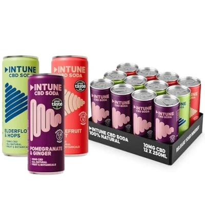 A VARIETY PACK OF SPARKLING CBD DRINKS TO SUIT EVERY MOOD – Enjoy three delicious flavours – Grapefruit & Mint, Pomegranate & Ginger, and Elderflower & Hops – in one convenient pack. Each CBD drink contains 10mg premium CBD and natural botanicals for calm focus and balance throughout your day. CBD INFUSED SOFT DRINKS MADE WITH REAL FRUIT AND BOTANICALS – Crafted in the UK, INTUNE CBD soft drinks blend vibrant fruit flavours with functional hemp CBD for authentic relaxation. Naturally vegan, gluten free and made without artificial sweeteners – a clean, refreshing way to drink CBD. ENJOY CBD RELAXATION DRINKS ANYTIME, ANYWHERE – Perfect straight from the can, poured over ice, or mixed into alcohol-free cocktails. Whether you’re working, socialising, or unwinding at home, INTUNE CBD cans deliver clarity and calm in every sip. LOW CALORIE FUNCTIONAL DRINKS FOR MINDFUL MOMENTS – Each CBD infused soft drink contains under 20 calories, with no added sugar. The ideal vegan, low calorie drink for focus and relaxation – refreshingly light, crisp and naturally functional. SUSTAINABLE, VEGAN AND MADE IN THE UK – Proudly produced in recyclable cans, INTUNE CBD drinks are designed for modern wellness. A botanical soda alternative that’s alcohol-free, sugar-free and flavour-full – the ultimate variety of CBD relaxation drinks to keep you in tune.