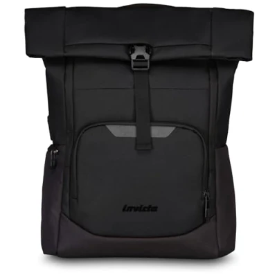 Dimensions: 30 x 45 x 15 cm Capacity: 24 litres Back: Fabric covered and padded; Straps: Preformed fabric-covered shoulder straps. Under mesh shoulder strap. Pockets: Laptop compartment with independent access up to 15.6'' (up to 38x26x2cm). External side pockets for water bottle. Tablet and smartphone pocket. Document Pockets, Key Hook Pocket, Power Bank Pocket Front zip pocket. Inner pockets covered with anti-scratch fabric and padded. Single-compartment roll-top backpack with reinforced bottom. Roll-up closure expands for extra storage Second access to main compartment via front zip. Adjustable and removable waist strap and chest strap. Tape for trolley rod housing. Reflective inserts and Invicta logo. Water repellent finish zip Metal puller with safety system. USB port Padded top handle. Fabric: 100% recycled polyester, GRS certified