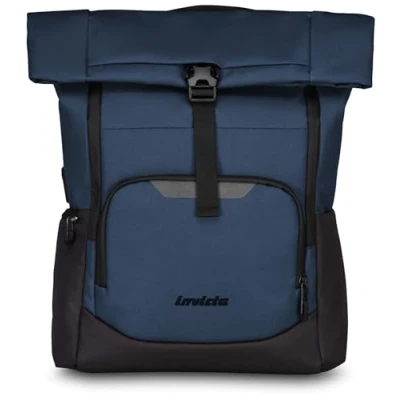 Dimensions: 30 x 45 x 15 cm Capacity: 24 litres Back: Fabric covered and padded; Straps: Preformed fabric-covered shoulder straps. Under mesh shoulder strap. Pockets: Laptop compartment with independent access up to 15.6'' (up to 38x26x2cm). External side pockets for water bottle. Tablet and smartphone pocket. Document Pockets, Key Hook Pocket, Power Bank Pocket Front zip pocket. Inner pockets covered with anti-scratch fabric and padded. Single-compartment roll-top backpack with reinforced bottom. Roll-up closure expands for extra storage Second access to main compartment via front zip. Adjustable and removable waist strap and chest strap. Tape for trolley rod housing. Reflective inserts and Invicta logo. Water repellent finish zip Metal puller with safety system. USB port Padded top handle. Fabric: 100% recycled polyester, GRS certified