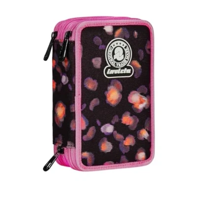 Invicta Fantasy 3 Zip School Case, Pink and Black, Triple Compartment Complete with Pens, Pencils Marker, Accessories, Elementary School, Girl, pink,