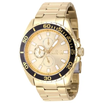 The Invicta 47577 has a 46 millimetres stainless steel case with a gold dial. This model is powered by an accurate Quartz movement. 5 bar water pressure resistant. This model is part of the Invicta Pro Diver collection. Including 2-year Invicta warranty.
