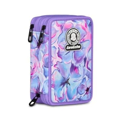 Invicta School Pencil Case 3 Zip Fantasy, Lilac, Triple Compartment Pen Holder Complete with Pens, Pencils, Colours, Accessories Backpack, Elementary School, Girl, Modern