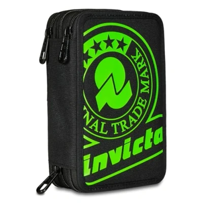 Invicta School Pencil Case 3 Zip, Solid Neon Print, Black and Green, Triple Compartment Complete with Pens, Pencils Markers, Accessories, Elementary