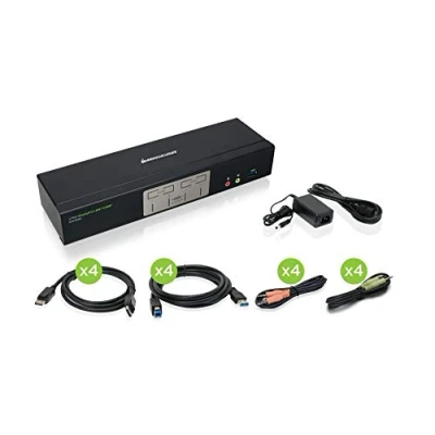 IOGEAR 4 Port 4K DisplayPort KVM Switch with Dual Video Out, RS 232 Command Control, Black, Push Button Actuator, ON OFF Operation Mode