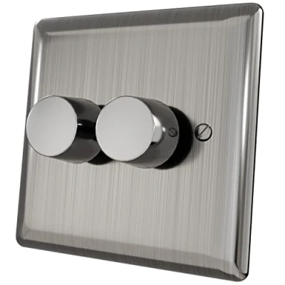 iolloi LED Dimmer Switch 2 Gang Way, Push on/off Rotary Trailing Edge for Dimmable Incandescent Halogen Bulbs, Brushed Steel, 3 100W (1 10 LEDs) Wall Outlet