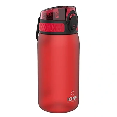 Ion8 Kids Water Bottle, 350 ml/12 oz, Leak Proof, Easy to Open, Secure Lock, Dishwasher Safe, BPA Free, Carry Handle, Hygienic Flip Cover, Clean, Odour Carbon Neutral, Red