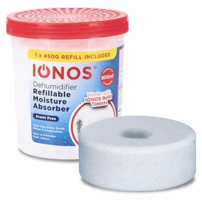 IONOS Dehumidifier, Refillable Moisture Absorber with 450 g Tablet Included Absorbs up to 900 ml, Works Refills, Unscented Damp Trap (IONRDEHUMSF1PB12)