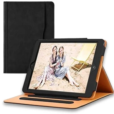 Compatibility - Black Tan Leather Cover Case designed specifically for Apple iPad Multi Angles Design - Strong magnetic connection to create tablet stands for your ipad smart cover. Fold the ipad case into the groove of the non-slip lining to form a strong stand in shape of apple ipad case. It can assist in avoiding joint pain with the help of angles which are provided to satisfy your viewing, typing and drawing needs Support Auto Wake/Sleep, the case automatically wakes or puts the new ipad to sleep when the lid is opened or closed; protects and extends battery life. Excellent Storage - Built-in organizer pocket. Use the Document Card Pocket to store your business cards, bank cards, notes, cash or bills while on the trip. Premium Quality - This ipad cover provides total full body protection against fingerprints, shocks, scratches and dust. Built with magnet closure which prevents accidental opening of the cover. Along with design its precise cut outs allow access to charge port, speakers, audio jack and volume can be accessed while in case Functional elastic strap-The external elastic closure strap adds an elastic closure to keep the case closed and protect the ipad when not in use Manufactured perfectly, Specially positioned cut-outs on the edges of the iPad case provide easy access to all the sockets, switches, and cameras. Easy to Install and Remove Very Easy and convenient to use.
