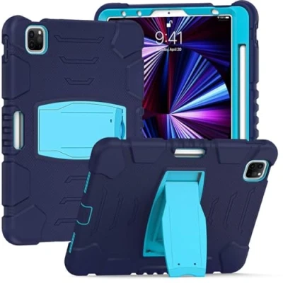 iPad Pro 11 2018/2020/2021 Tablet Cases, Covers with Kickstand, Heavy Duty Hybrid Shockproof Rugged Three Layer Case for Kids (Navy Blue+Blue)