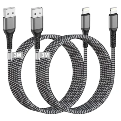 2.4A Fast Charge & Sync iPhone Charger Cable: The lightning cable with original chip, you can enjoy up to 2.4A fast charging. The iPhone cable built-in tinplate casing multiple shielding minimizes interference, ensure more stable charging current. The usb to lightning cable's excellent performance ensures that your device can still be charged and synchronized at a transfer speed of up to 480 Mbit/s. *Note: Please use the charger with 5V/2.4A. MFi Certification iPhone Charging Cable: Each iphone fast charger cable contains an authorization chip issued by to ensure 100% compatibility with iPhone, iPad, iPod, and there is no frequent pop-ups when connecting. The usb cable built with iphone's original terminal and smart chip. The iphone lightning cable with original 8 Pin connector and a lightning end, ensured safe charging for your iphone devices. Using this phone charger cables, you can enjoy fast data transfer, syncing and charging. Reliable and Durable iPhone Cable Fast Charging: Reinforced usb iphone charger cable with newly upgraded flash charging connector that can withstand 10,000 attempts to insert and remove it for extra protection and durability. The solid and durable two-shade braided nylon shield gives the usb charger cable stronger protection and flexible performance than other iphone wire, and no need to worry about tangling, effectively prolong the service life. iPhone Charger Wire Compatibility: This iphone charger lead passed MFI certified, built with MFi chip, promise no warning message pops up, ensures 100% compatibility with iPhone 14 Pro Max/14 Pro/14/13/13 Pro Max/13 Pro/13 mini/12/12Pro Max/12 Pro/12 mini/11/11 Pro /11 Pro Max/XR/XS/XS Max/X/10/8/8 Plus/7/7 Plus/6s Plus/6s/6 Plus/6/5s/5/SE, iPad Pro/Air/mini, iPod Touch (6th/5th generation), and the latest iOS system. 3M Perfect Length iPhone Lead: The 3M USB to Lightning cable offers even greater convenience and flexibility for charging your iPhone. With its extended length, you can comfortably relax in bed, settle into your favorite spot on the couch, or work at your desk while your device charges—without any constraints. Whether you're in the bedroom, office, or even in the backseat of your car, this cable provides the freedom to charge your devices in any position that suits you, making it an ideal companion for your daily life.