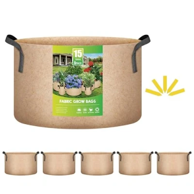 Fabric Material: These pots are made of 300g thickened non-woven fabric and are moderately permeable, eco-friendly and BPA-free. Can be washed and reused for future seasons Ideal for root development: Breathable fabric pots are air trimmed, prevent plant roots from circling and improve root structure to promote healthy root development Excellent drainage: it provides water drainage through the soil to avoid overwatering and allows your roots to breathe, resulting in healthier and stronger growth Easy to transplant: Handles are double thick and double stitched, durable bag with sturdy handle straps makes it easy and safe to move. Reduced risk of transplant shock Package: 5 Pack 15 Gallon Fabric Grow Bag Pot Size: Diameter 20 Inch, Height 14 Inch