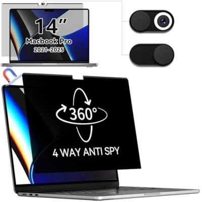 【Magnetic Installation】MacBook pro privacy screen can be installed in two seconds and easy to take off according to your needs. No worry about mess adhesives and air bubbles. Reduce the thickness of magnet by 50% but double the strength of magnetic attraction which make the privacy film stick to the screen tightly. No gap when closing the MacBook. 【Effective privacy & Anti Glare】 Multi-layered film limits viewing angle to +/- 30 degrees while providing a crystal clear screen straight-on, completely prevent others from peeping at your screen. This privacy screen Apple Mac 14 inch is reversible (matte/glossy): Gloss surface enhances privacy, matte surface reduces reflections. 【360° 4-Way All-Round Privacy Protection】Leveraging our innovative 360° privacy design, we deliver industry-leading 4-way (top, bottom, left, right) privacy protection. By precisely controlling the screen’s viewing angle, only the user directly in front can clearly see the content—fundamentally eliminating the risk of "shoulder surfing" from the sides. Whether you’re handling confidential documents in an open office, replying to important emails in a café, or using your laptop in public spaces like subways, it securely safeguards your sensitive information, giving you greater confidence in privacy safety. 【Compatible】Only Designed for MacBook Pro 14 inch 2021-2025 Release Compatible Model: MacBook Pro 14 Inch (Models: A2442, A2779, A2918, A2992, A3112, A3185, A3401) from 2021/2022/2023/2024/2025, including M1/M2/M3/M4/M5 chips. Not compatible with any other MacBook Pro models. 【Buy with confidence】IPROKKO specializes in providing customers with first-class screen protectors, magnetic MacBook Pro privacy filter are the ideal solution to protect your privacy in public places.This privacy screens are SGS certified.