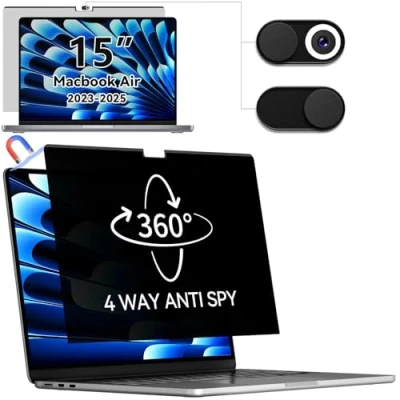 【Compatibility】esigned for the 15-inch MacBook Air released in 2023-2025, with precise dimensions and a perfect fit. Compatible models: [A3241 A3114 A2941]. MacBook air anti spy screen is the safe guard of your privacy in public places such as offices, airports, schools, hospitals, etc. 【360° 4-Way All-Round Privacy Protection】Leveraging our innovative 360° privacy design, we deliver industry-leading 4-way (top, bottom, left, right) privacy protection. By precisely controlling the screen’s viewing angle, only the user directly in front can clearly see the content—fundamentally eliminating the risk of "shoulder surfing" from the sides. Whether you’re handling confidential documents in an open office, replying to important emails in a café, or using your laptop in public spaces like subways, it securely safeguards your sensitive information, giving you greater confidence in privacy safety. 【Magnetic Installation + Nano suction】MacBook air privacy screen design with magnetic suction and nano suction, nano suction solves the problem of floating at the bottom, it can be installed in two seconds and easy to take off according to your needs. No worry about mess adhesives and air bubbles. The MacBook 15inch privacy filter reduce the thickness of magnet by 50% but double the strength which make the privacy film stick to the screen tightly. No gap when closing the MacBook Air 15. 【Anti Glare & Anti Blue Light 】Macbook 15in privacy screen is made of of the high quality Japanese PET film and designed with advanced optical technology to block 95% bluelight and UV light, effectively protect your eyes from visual fatigue. The smooth matte surface reduces glare and reflected light by 95%, you can see the screen clearly even in sunlight, outdoors or lighting with privacy screen Mac air 15.3". 【Magnetic Webcam Cover Slider】The webcam cover is designed with removable magnetic suction, tightly adsorbed and no worry about lose, it's super easy to slide open and close. The webcam cover protects MacBook webcam and blocks web peeped hackers to protect your security. 【Durable and Useful】IPROKKO specializes in providing customers with first-class screen protectors. Based on MacBook air 15 inch model screen, 1:1 perfect fit the screen. It is anti-scratch, anti-fingerprint and washable, adding an anti-scratch layer on the surface can effectively prevent the screen from being damaged, protecting both of security information and the macbook screen. Very durable and useful !