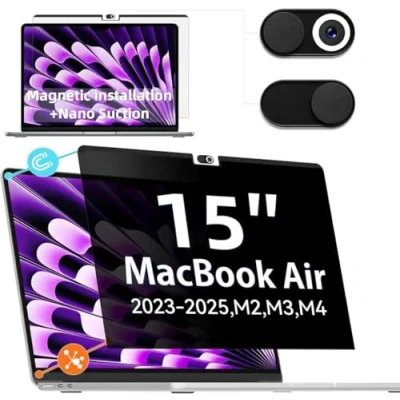 【Compatibility】Compatible with MacBook @@@XShAo8tjjkVS0U8JzPyEouZgb62ItXQn@@@ 15 in (2023-2025, M2 M3 M4 Chip) - Model A2941 A3114 A3241. MacBook air anti spy screen is the safe guard of your privacy in public places such as offices, airports, schools, hospitals, etc. 【Upgraded Privacy 】In order to limit viewing angles to +/- 28 degrees, we've revolutionized blind privacy technology, this macbook air 15 inch privacy screen protector completely invisible from the side. Not only the private protection upgrade, we also added a AR HD layer to improve the light transmittance and keep the retina display. The new Mac 15" privacy filter effectively protects privacy while maintaining 95% transparency. 【Magnetic Installation + Nano suction】MacBook air privacy screen design with magnetic suction and nano suction, nano suction solves the problem of floating at the bottom, it can be installed in two seconds and easy to take off according to your needs. No worry about mess adhesives and air bubbles. The MacBook 15inch privacy filter reduce the thickness of magnet by 50% but double the strength which make the privacy film stick to the screen tightly. No gap when closing the MacBook Air 15. 【Anti Glare & Anti Blue Light 】Macbook 15in privacy screen is made of of the high quality Japanese PET film and designed with advanced optical technology to block 95% bluelight and UV light, effectively protect your eyes from visual fatigue. The smooth matte surface reduces glare and reflected light by 95%, you can see the screen clearly even in sunlight, outdoors or lighting with privacy screen Mac air 15.3". 【Magnetic Webcam Cover Slider】The webcam cover is designed with removable magnetic suction, tightly adsorbed and no worry about lose, it's super easy to slide open and close. The webcam cover protects MacBook webcam and blocks web peeped hackers to protect your security. 【Durable and Useful】IPROKKO specializes in providing customers with first-class screen protectors. Based on MacBook air 15 inch model screen, 1:1 perfect fit the screen. It is anti-scratch, anti-fingerprint and washable, adding an anti-scratch layer on the surface can effectively prevent the screen from being damaged, protecting both of security information and the macbook screen. Very durable and useful !