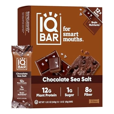 HEALTHY FRIENDLY PROTEIN BARS FOR BRAIN & BODY: IQBAR is a clean-label, low carb snack bar with 12g plant protein, 1–2g sugar, and only 2–3g net carbs. Gluten free, dairy free, and designed to keep you full, focused, and energized throughout the day. DIET FRIENDLY SNACKS FOR EVERY LIFESTYLE: Vegan protein bars that are gluten free, dairy free, soy free, and kosher certified. High in fiber with wholesome ingredients, perfect for keto, celiac, paleo, diabetic, and plant-based diets. A truly versatile snack option. CONVENIENT MEAL REPLACEMENT OR SNACK: Balanced macros with plant protein, healthy fats, and fiber make IQBAR a great choice anytime: breakfast replacement, post workout recovery, office snack, or travel fuel. A low carb protein snack that’s low sugar, keto-friendly, and satisfying. LOADED WITH FUNCTIONAL NUTRIENTS: Each bar features Lion’s Mane, MCT's, Magnesium, Vitamin E, and flavonoids to support focus, memory, and energy. A brain food bar packed with nootropics, perfect for school, work, travel, or a healthy on-the-go bite. ONLY 2–3G NET CARBS WITH 10 DELICIOUS FLAVORS: Each bar has 9–12g total carbs, 6–9g fiber, 10–13g healthy fats, and just 160–180 calories. Enjoy any of our delicious flavors which includes Chocolate Sea Salt, Peanut Butter Chip, Banana Nut, Chocolate Mint Chip, Almond Butter Chip, Lemon Blueberry, Matcha Chai, Wild Blueberry, Toasted Coconut Chip, and Salted Caramel Chip.