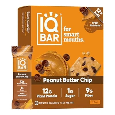 HEALTHY FRIENDLY PROTEIN BARS FOR BRAIN & BODY: IQBAR is a clean-label, low carb snack bar with 12g plant protein, 1–2g sugar, and only 2–3g net carbs. Gluten free, dairy free, and designed to keep you full, focused, and energized throughout the day. DIET FRIENDLY SNACKS FOR EVERY LIFESTYLE: Vegan protein bars that are gluten free, dairy free, soy free, and kosher certified. High in fiber with wholesome ingredients, perfect for keto, celiac, paleo, diabetic, and plant-based diets. A truly versatile snack option. CONVENIENT MEAL REPLACEMENT OR SNACK: Balanced macros with plant protein, healthy fats, and fiber make IQBAR a great choice anytime: breakfast replacement, post workout recovery, office snack, or travel fuel. A low carb protein snack that’s low sugar, keto-friendly, and satisfying. LOADED WITH FUNCTIONAL NUTRIENTS: Each bar features Lion’s Mane, MCT's, Magnesium, Vitamin E, and flavonoids to support focus, memory, and energy. A brain food bar packed with nootropics, perfect for school, work, travel, or a healthy on-the-go bite. ONLY 2–3G NET CARBS WITH 10 DELICIOUS FLAVORS: Each bar has 9–12g total carbs, 6–9g fiber, 10–13g healthy fats, and just 160–180 calories. Enjoy any of our delicious flavors which includes Chocolate Sea Salt, Peanut Butter Chip, Banana Nut, Chocolate Mint Chip, Almond Butter Chip, Lemon Blueberry, Matcha Chai, Wild Blueberry, Toasted Coconut Chip, and Salted Caramel Chip.