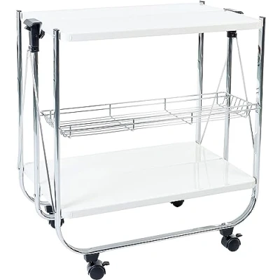 PRODUCT CONTAINS: 1 kitchen wagon with wheels DIMENSIONS: Open: 43.5 x 68.5 x 64 cm (W x D x H) - Height of product with wheels: 69 cm - Folded: 8 x 68.5 x 79.5 cm (W x D x H) - Height of product with wheels: 84.5 cm CAPACITY: 2 shelves and 1 mesh basket. Each shelf can handle up to 10 kilos of storage. The rolling cart is ideal for kitchen, living room or restaurant MOVABLE: The Kitchen wagon is equipped with removable and lockable wheels for 360° easy moves around the house. The wheels can also be removed for static storage DESIGN: The CW-005 kitchen wagon has two shleves without edges to make it easy to reach your stored belongings. The trolley is also foldable which makes it easy to store in your house while saving space MATERIAL: Metal