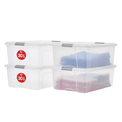 SMART INTERIOR STORAGE: Designed for everyday, ergonomic use adaptable to all individuals, these plastic boxes will prove practical with their integrated handle. Moreover, they facilitate transportation from one place to another due to their stable structure, secure lid, and locking clips that can withstand the recommended load. Additionally, the buckle's shape and color of this product have been crafted to suit various styles and tastes, making it suitable for use in numerous places such as the laundry room or bedroom. Also, its sturdy and reinforced lid allows for stacking multiple boxes of the same size, saving space PLASTIC STORAGE BOX CAPACITY: The volume of a box is 30L.The volume of this product is sufficient to store many items, Large objects, accessories, toys, notebooks and others STORAGE BOX DESIGN: The shape of this product has been designed to fit different styles and tastes and can be used in many places. In addition, its solid and reinforced lid allows different boxes of the same size to be stacked together, saving space STORAGE BOXES WITH LIDS DIMENSIONS : External : W39.5 x D58 x H21 cm | Internal : W31.5 x D48 x H18.5 cm |This product is 100% European made (factory located in Lieusaint, France) DELIVERY CONTENT: Upon delivery, you will receive a set of 4 plastic storage boxes with a 30 capacity each, featuring a sturdy and robust lid with clips on the sides. Additionally, these products are delivered in strong and durable standard packaging MATERIAL: This ensures resistance to shocks and impacts as well as easy cleaning of the storage box with a lid. Similarly, these plastic storage boxes with click-lock closure will allow you to keep all your items secure and visible thanks to a durable and transparent polypropylene material and BPA free