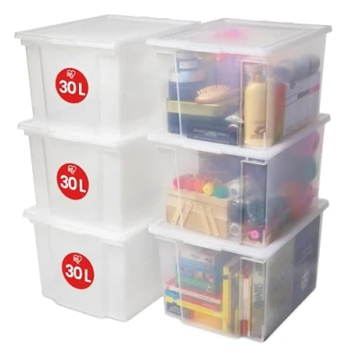 Iris Ohyama, Versatile Storage Boxes, Durable Plastic, 30L, Set of 6, Clear, Easy Latch, Stackable, Organisation, for Closet, Shelves, Classroom, Room, Dressing, Toys, Shoes, Art Supplies, USB M