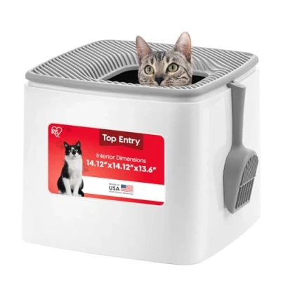 MADE IN USA with global materials: The IRIS USA top entry kitty litter tray offers a functional and aesthetically pleasing solution to your cat's bathroom needs. With the top entry kitty litter box, everything stays inside and out of sight, and the enclosed design lessens the prevalence of unpleasant odors in the room, something that's sure to make everyone in the family happy. TOP ENTRY: The top entry of the cat litter pan means more privacy for your cat, less litter spillage, and any spraying remains contained within the tall walls of the kitty litter box. It also functions to keep other pets, such as dogs, out of your cat's business, making for a stress-free environment for everyone. TIDY & ORGANIZED: The lid grooves catch litter particles from your cat's paws, keeping the area neat and making clean-up easy. Plus, the included scoop hangs from the litter pan side, ensuring it's always within reach, so you'll never have to hunt for it again. Easy Clean: The IRIS Premium Top Entry Litter Box fits a standard 13-gallon bag, minimizing mess and making clean-up effortless. Keep your space tidy and enjoy more time with your furry friend! GREAT SIZE: Outside Dimensions: 17.25"L x 17.25"W x 14.88"H, Inside Dimensions: 14.13"L x 14.13"W x 13.63"H, Entry: 7.9"W x 7.9"H
