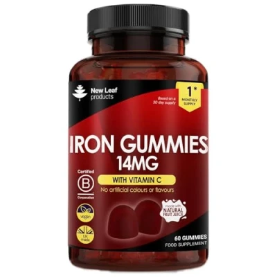 DISCOVER NEW LEAF'S IRON GUMMIES - Our Iron Gummies provide a delightful & easy solution to combat tiredness and fatigue. Designed to help you re-energize and support your body, our gummies offer multiple benefits. Iron plays a vital role in boosting natural defenses, and contributing to the formation of red blood cells, which impacts various bodily functions such as hair growth. Embrace your day with focus, power, and strength by incorporating our Iron Gummies into your routine. BENEFITS OF IRON SUPPLEMENTS - Iron holds numerous benefits for the body, playing an essential role in vital functions. From enhancing cognitive function and energy metabolism to supporting red blood cell formation, oxygen transport, and immune system function, iron is a crucial nutrient. Additionally, iron aids in reducing tiredness and fatigue while playing a role in the process of cell division. Claims supported by (EFSA) WHY CHOOSE OUR IRON GUMMIES? - At New Leaf, we believe in making self-care enjoyable. Our Iron Gummies are easy to swallow, making them a delightful treat rather than a chore. With a maximum-strength formula of 14mg per dose, our gummies offer one of the highest iron concentrations available. Each pack contains 60 gummies, ensuring a 1-month supply. Moreover, our Iron Gummies are vegan and gluten-free, catering to various dietary requirements. WHO CAN BENEFIT FROM THESE IRON SUPPLEMENTS? - Our Iron Gummies are designed for anyone seeking a natural energy boost. Iron is essential for everyone, especially those who struggle to obtain sufficient iron through their daily diet. Vegetarians, vegans, women, and pregnant women are particularly prone to iron deficiency due to diet and increased demands on the body. Iron deficiency can manifest as fatigue, weakness, dizziness, shortness of breath, poor circulation, and headaches. SAFETY & QUALITY - To uphold the highest standards of safety and quality, our products undergo post-production testing for heavy metals and other unwanted compounds, ensuring full compliance with international regulations. Once testing is complete, products are bottled and packaged in BRC Grade AA certified facilities, guaranteeing that our rigorous quality standards are reliably maintained and delivered to you. Why Choose New Leaf Products? As a family-owned business with extensive experience in formulating and producing our unique range of over 100 vitamin and mineral supplements, we are dedicated to upholding the highest standards of safety and quality. We prioritise environmental sustainability and social responsibility, donating a portion of our sales to global causes. Join our community of over 2 million satisfied customers, where our customers are always our top priority.