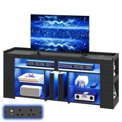 Your Personal Storage Hub: Skip searching for controllers/wires pre-gaming. Our partitions assign each gear a spot: wide top fits soundbar perfectly; central slot houses PS4; side caddies and adjustable shelves for easy access and display collections. Enjoy a spacious, organized space. RGB Lights - Boost Every Mood: Lack cinema vibe or gaming immersion? Control via APP/remote: multi colors/ dynamic modes , adjustable brightness/speed. Deep blue for adventures, warm orange for romance, pulsating hues for gaming. Lights are your mood partner, not just decor. Power Hub, Not a Mess: It has a 2-in-1 Integrated Power: 2 sockets + 1 USB + 1 Type-C, powering TV, console, phone at once. No more socket fights or extension cords. 2 Hidden cable holes keep wires out, for a clean, distraction-free space. Showcase Your Style, Effortlessly: No style-function trade-off. Carbon fiber finish is sleek, scratch-resistant, waterproof—wipe spills/dust easily. Adjustable/ removable tempered glass shelves fit any size of item. Minimalist black blends into living rooms, bedrooms, game rooms. Rock-Solid & Easy to Assemble: Worry about complex assembly or unstable support? Reinforced wood frame can totally hold 90kg (65-inch TV). Raised edges prevent falls, safe for families. Labeled parts and clear instructions let beginners assemble easily.