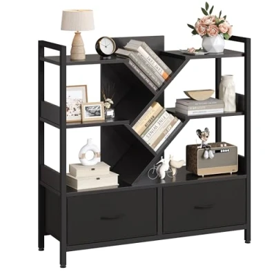 【CLUTTER-FREE DISPLAY & HIDDEN STORAGE】8 Open Shelves+2 Fabric Drawers – Showcase books, photo frames, plants, or game consoles on the easy-access shelf. Tuck away cables, craft supplies in the non-woven drawer, delivering a clean, minimalist look for your home instantly. 【MOVABLE & FIXED: FLEXIBILITY】Attach the 4 smooth-rolling casters (2 with locks) to glide it from the bedroom to the living room for movie nights, the study for work or the balcony for relax. Swap for 4 adjustable levelling feet to keep it steady on uneven floors—perfect for rentals or carpeted spaces. 【UNIQUE Y-TREE & SPACE-SAVING】Transform your books and decor into a stylish gallery with this modern bookcase. Its compact 100x100cm frame fits perfectly in tight corners, small flats, or by your sofa, making every inch count in your limited space. A functional sculpture for any home style. 【100KG CAPACITY & DURABLE SAFETY】 Built with steel frame and solid back panel, it boasts a total weight capacity of 100KG. 8cm tall side guards on shelf add extra security, while the scratch-resistant surface wipes clean easily - handling daily spills and scuffs with no fuss. 【QUICK ASSEMBLY & SEAMLESS LOOK】 No complex DIY! All tools, labeled parts, and clear step-by-step instructions are included—nice to one person. Decorative screw covers hide hardware for a seamless, furniture-store finish that elevates any room.
