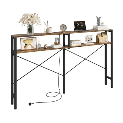 【Behind Couch Table with Outlet】This slim console table features 2 power sockets, 2 USB port (with a 1.5m power cord), making it perfect for charging phones, laptops, and lamps—no more low-battery worries! 【Space-Saving Slim Design】Measuring 180 x 20 x 104 cm (L x W x H), this narrow sofa table fits snugly in small spaces like apartments and bedrooms. 2 practical shelves neatly organize your daily items. 【Versatile & Stylish】Use it as a console table, sofa table, or entryway table—ideal for keys, magazines, and plants. Its retro-industrial design complements living rooms, bedrooms, offices, and hallways. 【Sturdy & Durable】Built with a black metal frame, engineered wood top, and reinforced X-legs, this table supports up to 20kg and includes anti-tip protection for stability. 【Quick Assembly】Includes numbered parts, clear instructions, and tools—easy setup so you can enjoy it right away!