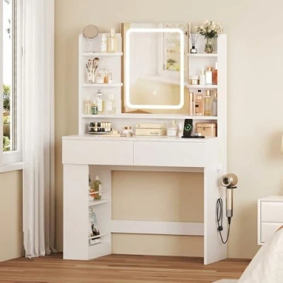 【Mirror with built-in LED lights】This vanity table features a hidden LED strip framing the mirror, offering 3 colour modes (warm, natural and cool). You can change the colour mode by pressing the touch switch or adjust the brightness by long pressing the touch switch 【Convenient Charging Station & Hair Dryer Stand】This white dressing table with 2 AC power outlets, 1 USB port & 1 Type-C port, allowing you to charge devices while getting ready, plus a holder for your hair dryer.Keep your hair dryer, mobile phone and curling iron within arm’s reach, making it the ideal addition to your dressing room, bedroom or home beauty corner 【Modern DIY Design】Our practical white vanity desk features a side storage space that can be installed on the left or right side based on your preferences, that maximises every inch of available space, keeping all your essentials within easy reach 【Ample Storage Space】This bedroom dressing tables 4 open compartments for perfumes or toners; 2 shelves for lipsticks or face creams; and 2 drawers for cotton pads, eyeliners, and jewelry, ensuring everything has its place and everything is neatly organized 【Sturdy & Easy Assembly】This dressing table with mirror is made of high-quality particle board, which is wear-resistant and easy to clean. It includes detailed illustrated instructions, necessary hardware and clearly labeled parts, helping you to quickly enjoy your new vanity. Measures 40 cm deep x 90 cm wide x 145 cm high