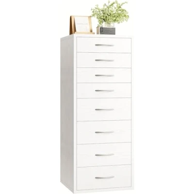 【8-layer Drawer Storage】: Measuring 40x41x105cm, this narrow 8 drawer chest of drawers extends your vertical storage space, providing ample storage space for various household items and achieving layered organisation. In addition, the wide tabletop can accommodate some decorations for your decorating needs. 【With 2 different Sizes】: The combination of 4 large drawers (size: 34*31*9.6cm) and 4 small drawers (size: 34*31*6cm) provides you with diverse storage options. 4 small drawers can hold ties, socks and jewellery, while the 4 large drawers hold cosmetics, clothes, trousers and sheets. 【Modern Minimalist Style】: White wood grain and smooth lines create this elegant and stylish bedroom furniture. The silver handles not only make it easy to pull out the drawers, but add a sense of uniqueness and make the dresser even more attractive. 【Space-saving and versatile】: this narrow chest of drawers measures just 40 x 41 cm, making it ideal for any room. Use it as a tallboy, dining cupboard, filing cabinet, or living room storage. Whether placed alone, paired, or combined with a desk or dresser, it adds a stylish touch to your home. 【High-quality workmanship】: Made from high-quality wood materials and equipped with metal drawer runners for quiet and smooth opening. A sturdy anti-tip device ensures additional safety. 【Easy assembly】: Pre-installed rail systems and numbered components enable quick and uncomplicated assembly. In no time, you'll have a stable and extremely practical storage cabinet.