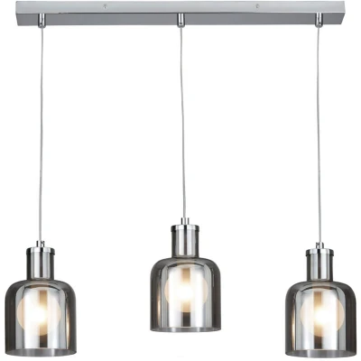 General description Elevate your living spaces with the sleek, modern Irvine 3 Light Ceiling Diner Pendant. Featuring three smoke-tinted glass shades with chrome accents, this 3-light ceiling pendant balances style and function. It offers an adjustable drop to perfectly position above a kitchen island or breakfast bar, delivering focused, ambient light. Technical specifications Product Type: Ceiling Pendant Bulbs Required: 3 (Not Included) Bulb Type: G9 Max Bulb Wattage: 3 Watt Max Bulb Voltage: 240 Volt Light Source: LED Height: 100 cm approx. Width: 13 cm approx. Length: 68 cm approx. Ceiling Cap Dimensions: 2.5 x 65 cm approx. Drop: Max: 100 cm, Min: 35 cm approx. Material: Metal, Glass Colour: Polished Chrome, Smoke Tint Weight: 2.4 kg