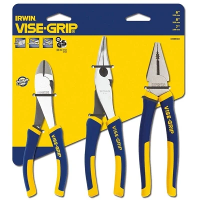 General description This Professional Set of 3 Irwin Pliers includes three high-quality multi-purpose hand tools designed for various tasks in DIY and home improvement projects. Each tool features durable construction and ergonomic handles for comfort during use. Technical specifications Diagonal Cutting Pliers: 150 mm (6 in) Long Nose Pliers: 200 mm (8 in) Universal Pliers: 175 mm (7 in) Compatibility and accessories Suitable for cutting, gripping, and bending No additional accessories required Installation No installation necessary; tools are ready to use straight out of the box Usage Diagonal cutting pliers for cutting wires and small metal components Long nose pliers for gripping and manipulating small objects or reaching into tight spaces Universal pliers for gripping, twisting, and holding various materials Other information Induction hardened chromium nickel steel cutting face for longer sharpness Machined jaws for maximum gripping strength Moulded ProTouch™ handles for added