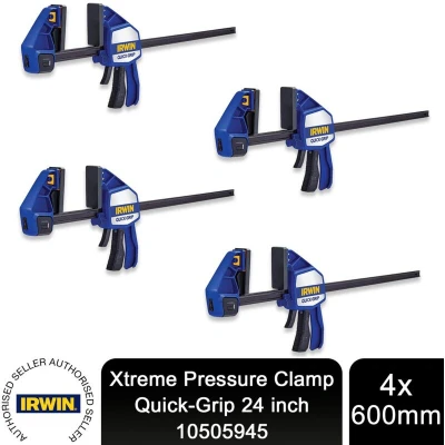 General description The IRWIN® Quick-Grip® Xtreme Pressure Clamp 600mm (24in) is designed for one-handed operation, providing a powerful clamping force of 250kg. Its innovative features make it ideal for various clamping tasks, ensuring efficiency and ease of use. Technical specifications Clamping force: 250kg Length: 600mm (24in) Compatibility and accessories Compatible with a wide range of Quick-Grip® Clamp Accessories Installation Tool-free, Quick-Change™ function for easy jaw reversal to perform spreading action Usage Longer length jaws with unique swivelling action maintain constant pressure on uneven surfaces Bar rest feature allows for hands-free placement of larger items in the clamping jaws