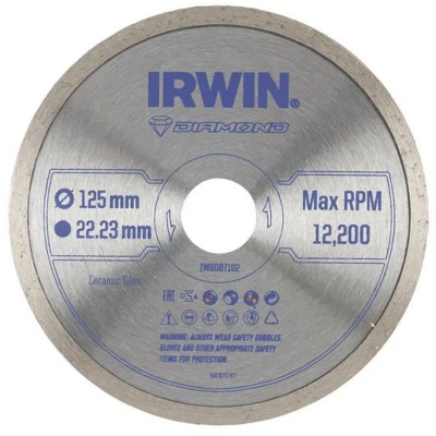General description This diamond cutting disc is designed for cutting tiles, including ceramic, floor, and wall tiles. It provides clean, precise cuts and is suitable for various construction and renovation projects. Technical specifications Diameter: 125 mm Bore size: 22.23 mm Type: Diamond cutting disc for tiles Compatibility and accessories Compatible with popular angle grinders No additional accessories required for installation Installation Ensure the grinder is unplugged before installation Attach the disc securely to the grinder's arbor Check that the disc is properly mounted before use Usage Use with appropriate safety gear, including gloves and eye protection Operate at recommended speeds for optimal performance Apply steady pressure during cutting for best results Other information 1 x IRWIN® Continuous Rim Diamond Blade 125 x 22.23mm