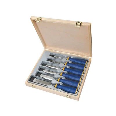 General description Set of 6 Marples MS500 Series All-Purpose Chisels featuring ProTouch™ Handles. This set includes chisels in various sizes, designed for versatility and ease of use, and is supplied in a sturdy wooden box. Technical specifications Sizes included: 6, 10, 12, 19, 25, & 32mm (1/4, 3/8, 1/2, 3/4, 1 & 1 1/4 in) Type: bevel edge Other information Metal striking cap allows use with a hammer, prolonging the life of the handle and preventing mushrooming Soft-touch handles are oil and water resistant for improved comfort and reduced slippage Handle design reduces vibrations and hand fatigue One piece blade forging for added strength and durability Special tool steel ensures a sharper cutting edge for quicker operation Special hardening process gives the blade a longer lasting edge, reducing re-sharpening time Blade is hardened to the last inch for more effective use Chisels are honed and sharpened, ready for immediate use