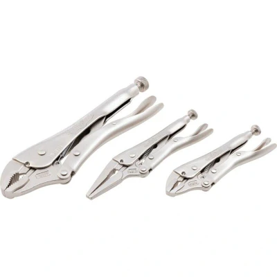 General description The IRWIN® Vise-Grip® 3 piece Locking Plier Set includes two Curved Jaw Locking Pliers and one Locking Long Nose Pliers, designed for a variety of applications and material shapes. Made from high-grade heat-treated alloy steel, these pliers ensure maximum toughness and durability. The hardened teeth grip from any angle, while the classic trigger release provides maximum locking force. Technical specifications Curved Jaw Locking Pliers (10WR): Length: 254mm (10in), Capacity: 48mm Curved Jaw Locking Pliers (5WR): Length: 127mm (5in), Capacity: 29mm Locking Long Nose Pliers (6LNC): Length: 150mm (6in), Capacity: 51mm Usage The hex key adjusting screw tightens to adjust pressure and draw materials together, providing a controlled release. The Locking Long Nose Pliers feature a powerful locking action, with jaws designed to reach into tight spots and tips small enough to grip tiny objects. Additionally, the pliers incorporate a wire cutter for added functionality.