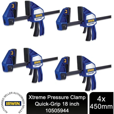 General description The IRWIN® Quick-Grip® Xtreme Pressure Clamp (450mm/18in) is designed for one-handed operation, providing a powerful clamping force of 250kg. Its innovative features include a tool-free Quick-Change function that allows the jaws to be reversed for spreading actions, making it versatile for various applications. The longer length jaws with a unique swiveling action ensure constant pressure on uneven surfaces, while the bar rest enables hands-free placement of larger items in the clamping jaws. Technical specifications Brand: Irwin Type: Xtreme Pressure Clamp Model Number: Q/GXP18N Clamping Force: 250kg Length: 450mm (18in) One-handed operation Includes 4 clamps in a pack Compatibility and accessories Enhance your clamps with a wide range of Quick-Grip® Clamp Accessories. Other information