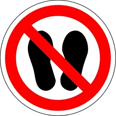 ISO Safety Label Sign - International Do not walk or stand here Symbol Self adhesive sticker 100mm Diameter Remove backing film and apply to dry, smooth, oil free surface. Digitally printed and laminated for extra durabillity