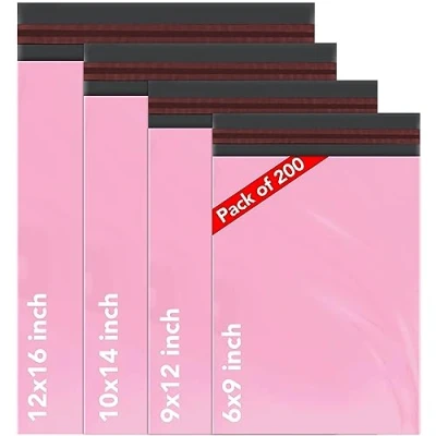 ISOUL 200 Mixed Size Baby Pink Mailing Bags, Self Seal 4 Strong Waterproof Poly Plastic Envelopes for Parcels, Packaging, Small, Medium, Large Mail, Shipping Delivery Bags