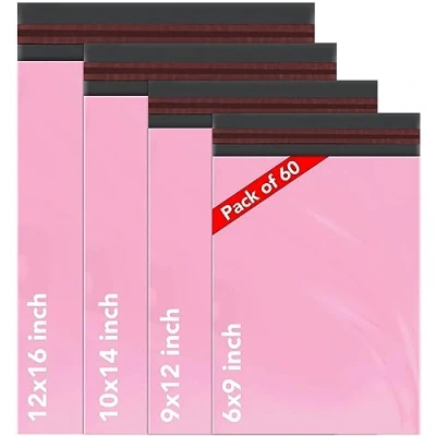 ISOUL 60 Mixed Size Baby Pink Mailing Bags, Self Seal 4 Strong Waterproof Poly Plastic Envelopes for Parcels, Packaging, Small, Medium, Large Mail, Shipping Delivery Bags