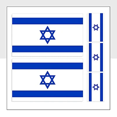 Pack Contains: Mixed Pack of 5 Israel Flag Stickers - Pack of 2 (100 x 60 mm) + Pack of 3 (60 x 36 mm). Glossy vinyl flag Stickers with long lasting Adhesive power. Suitable for both outdoor and indoor uses. Can be used to stick on Cars, Bikes, Cycles, Laptop, Cards, Helmets, Fridge, Windows, Bumpers etc. Ideal for Arts and Crafts. Stick on dry clean and smooth surface. Prompt delivery.